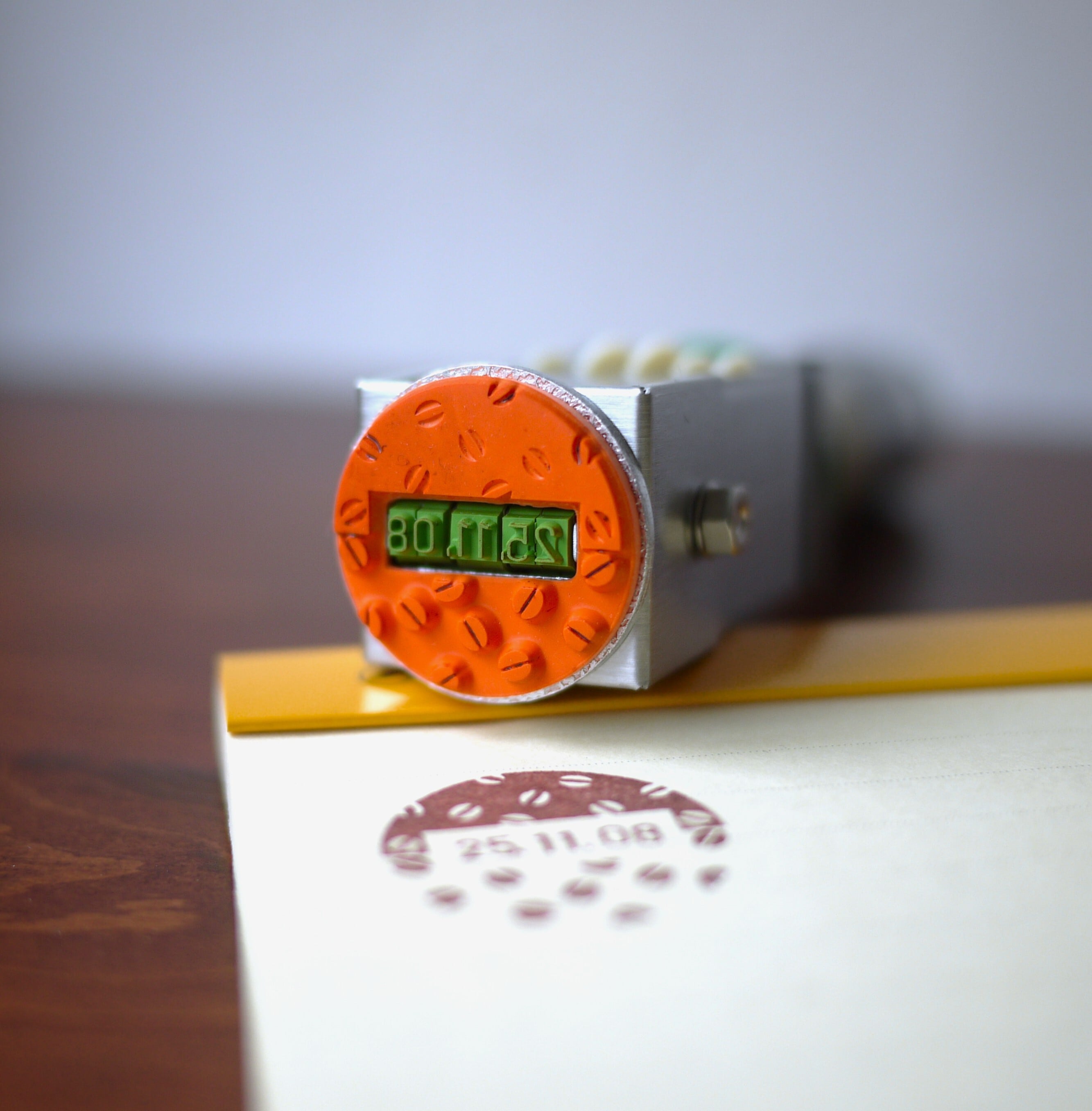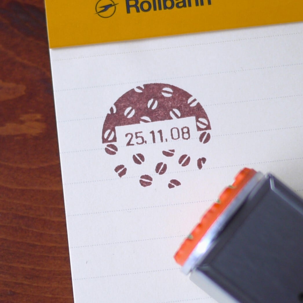 福わけはんこらしい“コーヒー豆の総柄”で仕上げた、まるいシルエットの日付印です。