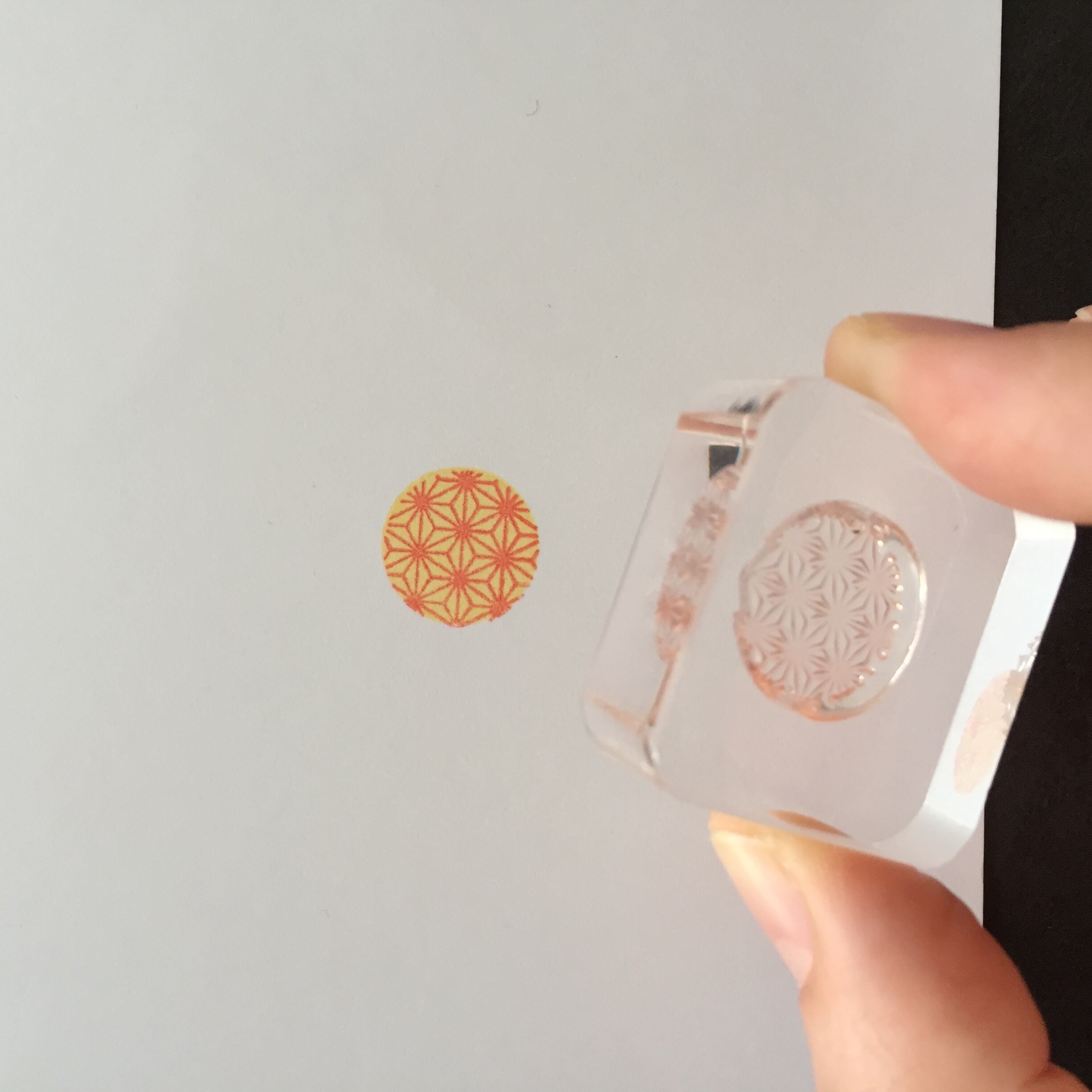 アクリルブロックにスタンプを貼り、インクを付けてはんこを押します。